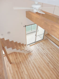 ロフトから見たリビングダイニングですが、眺めが良好です。換気のためのダクト配管は、木枠で囲い化粧梁として見せ、勾配天井の空間に自然な感じで調和しています。