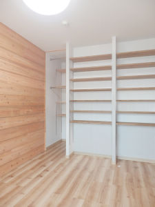 洋室の子供部屋は、本を効率よく収納できるように可動式の造作棚を多数、設置しました。床のフロアーは、リアルな木目模様のメープル柄のフローリングを採用しました。