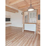 リビングダイニングと和室から、開放的で広々とした、優しい雰囲気のリビングダイニングに変更しました。リビングダイニングの正面の壁には、薄型液晶テレビを設置しました。