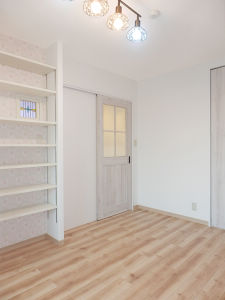 洋室の子供部屋は、本を効率よく収納できるように可動式の造作棚を多数、設置しました。床のフロアーは、リアルな木目模様のメープル柄のフローリングを採用しました。