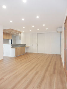 西宮市で リビングとダイニングと和室、キッチンを、一体的なリビングダイニングキッチンへ間取りの変更、水まわり設備や床材、建具の取り替えなどのデザインリフォーム・リノベーションを行いました。