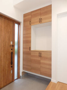 玄関収納は、据付けタイプのボックス型玄関収納です。豊富な収納量で、家族の履物や備品をしっかり収納できます。間口にすっきり綺麗に収まりました。