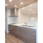 キッチンで家事をしながらリビングダイニングを眺めることができるように、対面式のオープンキッチンに変更しました。キッチンの上部に吊戸棚を設けずオープンにする事で、一体感を高めることができます。