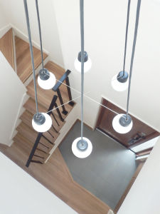吹き抜けから見た玄関と階段ですが、眺めが良好です。吹き抜けの天井には、意匠性も良好な六角形の幾何学模様をイメージしたペンダント照明を設置しました。