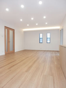 広々とした20帖のリビングダイニングです。リビングダイニングの壁の一面に、端から端までの間口の広い使い勝手の良い収納を設けることで、部屋が片付きやすく広く使う事ができます。