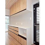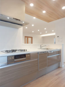 キッチンで家事をしながらリビングダイニングを眺めることができるように、対面式のオープンキッチンに変更しました。キッチンの上部に吊戸棚を設けずオープンにする事で、一体感を高めることができます。