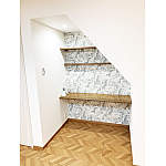 お部屋のデッドスペースを蓄熱暖房機の設置場所だけでなく殺風景にならないよう飾り棚でアクセント、ご主人様がお選びされたクロスがマッチしモダンに。