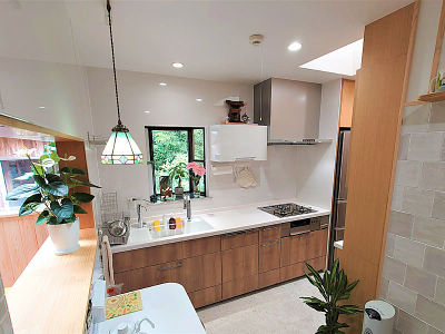 キッチン本体を収納力のあるリフォムスキッチンに変更。スキマレスシンクや、ホットクリーンフードを採用し掃除のしやすいキッチンに。調理補助機能付のコンロ、食洗器、センサー水栓を採用し機能面でも使いやすく。