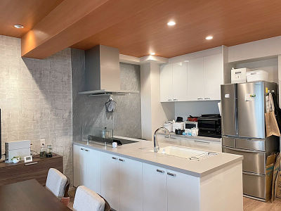 マンションの全面リフォームをお願いしました。依頼をしたきっかけは、以前に実家の内装のリフォームをしていただいたのを見て、我が家もお願いしようと思いました。改装に際して、大きな家具類や電化製品の運び出しは個人でするには難しかったのですが、全て大工さん、設備の方に動かしていただき助かりました。ウォークインクローゼットや各種棚等も閉鎖感がでないようにとの気遣いと、使いやすさを考慮しての設計・施工には感激しました。キッチンについてもアイランド型にするのに、レンジフードからのダクトの設置等色々と難しい問題がある中、スッキリと納めていただけました。またマンションという限られた空間の中で、希望通りのバスルームの拡張は感謝しています。各部屋の照明もダウンライトを取り入れて頂けたので各部屋ごとに天井・壁のクロスにこだわってもスッキリと納まり満足しました。またリフォームを考えた時はお願いしたいと思います。