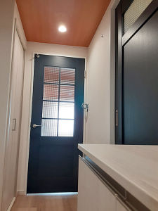 玄関に立った時に、クラフトレーベルの格子ガラスの扉が目に入りLDKへと繋がる空間への期待感が持てる雰囲気を作った。ドアはネイビーブルーで統一して靴収納の折れ戸と玄関コンポリアはホワイトアッシュでメリハリを出した。