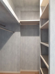 ウォークインクローゼットの内部 ハンガーパイプに衣類を掛けて収納して梁の部分も同じ高さで棚を新設して収納部分を確保