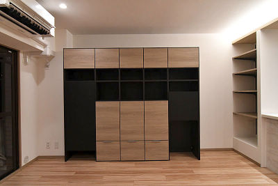 キュビオスはツートンカラーでリビングのアクセントに。オープンキャビネットで見せる収納。扉部分には雑然としがちな小物雑貨をスッキリ収納。