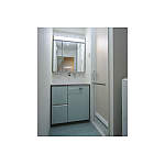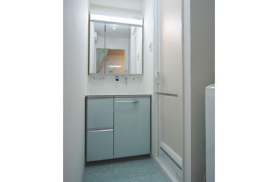 グリーン系のカラーが涼しげな洗面室。3面鏡の中にたっぷり収納できて、見た目スッキリ!洗面台の扉に合わせて、床も大好きなグリーンでコーディネイト。