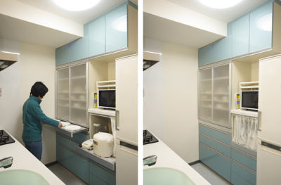配膳するときだけ引き出せるスライド棚はとっても便利。キッチンがすっきり片付く抜群の収納力にも大満足。