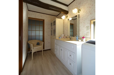 浴室と居室の間に新たにつくった脱衣室には、奥様がショップでひと目惚れされた輸入物の洗面台を設置。明るく広々空間だから入浴前も入浴後もゆったりと過ごせるようになりました。