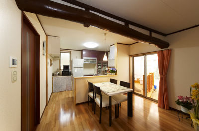 古民家の雰囲気を活かしつつ、対面キッチンに壁掛けテレビという利便性の高いプランをご提案しました。