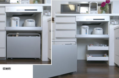 軽く動かせるキャスター付きのワゴンには、ゴミ箱を収納。ワゴンを出せば、キッチン横の壁際に引き出し式のコーナー収納が現れます。缶詰などの買い置き品を保管するのに重宝します。