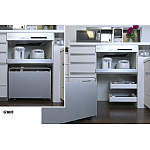 軽く動かせるキャスター付きのワゴンには、ゴミ箱を収納。ワゴンを出せば、キッチン横の壁際に引き出し式のコーナー収納が現れます。缶詰などの買い置き品を保管するのに重宝します。