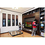 リビングの壁一面に、大容量収納システムファニチャー「キュビオス」を設置。家族それぞれの専用コーナーを決めました。お子様が、宿題やおもちゃなどを楽しんで片付けられるように。