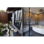 ご主人こだわりのシステムバスルーム「ココチーノ」は、透明の扉と大きな窓で視界が広がる空間に。坪庭やウッドデッキを併設して、開放感もたっぷり。テレビを見ながら2時間入られることもあるそうです。