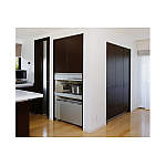 キッチンの一角にビルトインした、たっぷりの収納。扉の内部には、たくさんの食器がきちんと片付けられています。中段は蒸気処理機能付きに。炊飯器を収納したまま炊飯できるので、重宝されています。
