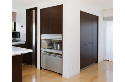 キッチンの一角にビルトインした、たっぷりの収納。扉の内部には、たくさんの食器がきちんと片付けられています。中段は蒸気処理機能付きに。炊飯器を収納したまま炊飯できるので、重宝されています。