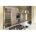 鏡面と半透明の扉で清潔感に温かみをプラスしたシステムキッチン「リビングステーション」は、出し入れもスムーズにできて奥様のお気に入り。