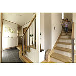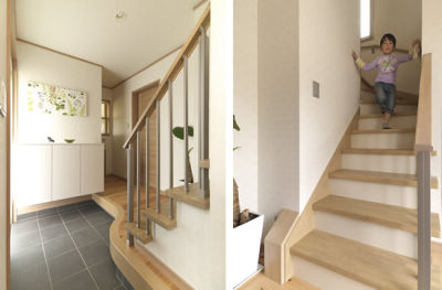 帰ってきたときにホッとした気分になれる、ナチュラルテイストの玄関。階段の手すりは幼稚園のお子様にも握りやすく、昇り降りをサポートしてくれます。