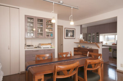 以前は中途半端な広さの小上がりがあり、物置状態になっていたダイニング。小上がりを取り除き、バリアフリーの床にしたことで、以前より広く感じられるように。カップボードもぴったり壁面に収まって、ゆったりとティータイムを楽しまれています。