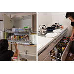 上吊戸は手元まで降ろせる「ソフトダウンウォールユニット」に。脚立なしで高いところのものを取り出せて便利です。コンロ下には調味料がたっぷり入り、料理をしながらサッと出してサッとしまえます。