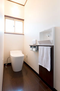 便座が大きくて座ったときに安定感がある全自動おそうじトイレ 「アラウーノ」。タンクレスになって見た目もすっきり。広々した空間に感じます。美しい木目柄の床「ベリティス」で高級感あふれるトイレに生まれ変わりました。