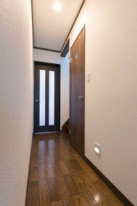玄関からリビングへ向かう廊下もダークブラウンでまとめました。床材の多彩なカラーバリエーションから奥様がお好きなブラウンの色を実現。