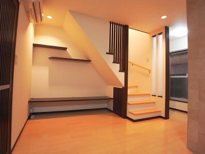 家の中心あった階段が、1階を分断して使いづらい状態の間取りでした。階段の位置を大幅に変えることで、リビング・キッチン・和室が一体となった、広々とした空間ができました。階段下はテレビスペースになり、部屋のアクセントにもなっています。色は、シックなダークブラウンでカラーコーディネイト。急な階段は緩やかになり、トイレも広くなり、安全性がグレードアップ!くつろいだり、家族が集まったり…楽しみが増えたお家になりました。