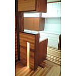 天井・壁・床 全てに無垢材を使用し木の持つリラクゼーション効果とあたたかさを満喫していただき、その中で、キッチン~ダイニング~脱衣室・寝室の導線にも気を付け出入口も車いすが十分使える寸法で提案しました。また限られた台所スペースも天井高を最大限に上げ化粧梁を見せることで空間に奥行を持たせ、壁埋め込み照明で遊び心も取り入れました。寝室につながる廊下の床には畳の縁のない琉球畳を使い、素足で歩いてもあたたかく転んでも安全なように配慮しました。また、この畳の廊下にキュビオスとクローゼットを配置することで廊下を納戸代わりに使っていただけるようにしました。
