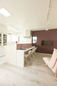 白いキッチン、ホワイトオーク柄の床材は「清潔感のある白が好き」とおっしゃる奥様のこだわり。以前は家族が団らんできる場所がなく、台所は食事をするだけの場所でしたが、今では食後もご家族いっしょに過ごすようになりました。