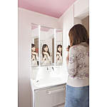 ウツクシーズの洗面化粧台は大きなボウルと三面ミラーがお気に入り。ツインラインLED照明は顔に陰ができにくく、メイクがしやすいそう。水栓は引き出して使えるので、髪を洗ったりおそうじなどに便利に使われています。