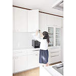 奥様の身長は150cm。吊り戸棚の上段や奥のほうには手が届かず、整理整頓が大変なため、内部が見えるガラス張りではなく、扉タイプを選びました。「とにかく収納量が多くて、今は空きスペースがいっぱい。これから少しずつ必要なモノが増えていくと思います」(奥様)