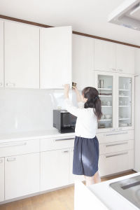 奥様の身長は150cm。吊り戸棚の上段や奥のほうには手が届かず、整理整頓が大変なため、内部が見えるガラス張りではなく、扉タイプを選びました。「とにかく収納量が多くて、今は空きスペースがいっぱい。これから少しずつ必要なモノが増えていくと思います」(奥様)