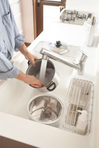 実際に洗い物をしてみると、シンクの広さを実感!パスタでよく使う寸胴鍋も、ご覧の通り余裕で洗えます。「四角い排水口は水はけがいいですよ」とご主人。