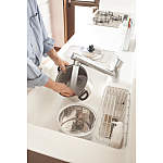 実際に洗い物をしてみると、シンクの広さを実感!パスタでよく使う寸胴鍋も、ご覧の通り余裕で洗えます。「四角い排水口は水はけがいいですよ」とご主人。