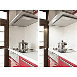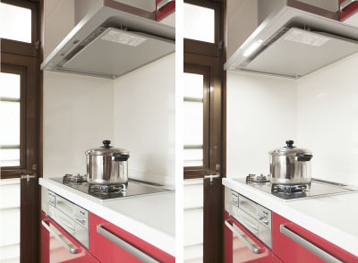 コンロの火をつけると、LEDライン照明が自動的に点灯。同時にファンが回りはじめます。「最近のキッチンって本当に便利! 使い終えた後、照明がついたままだとコンロがつけっぱなしとわかるので、消し忘れ防止にもなりますよ」(奥様)