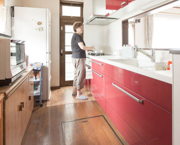 パナソニックのショウルームでリフォムスのキッチンを見て、PaPaPaシンクの便利さや収納量の多さにナットク! ご主人が価格面と機能性を考え合わせ、リフォムスに決められました。スモーキーレッドのカラーを選んだのもご主人。ご夫婦ともお気に入りです。