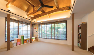 中2階のキッズルーム兼リビングは天井の梁を活かし、ブラインドもウッド調にして、バリのリゾートにあるコテージの趣に。間接照明のやわらかい光が高級感を演出しています。