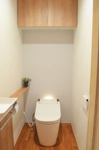 老後2人で過ごすので、トイレは自動で快適なものにしました。また、水周りだからこそあまりしない自然素材を使用し、空気が澄む空間に仕上げました。