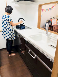 今までのキッチンから印象を変えて、雰囲気と色をガラリと変えました。コンロはガスから電気になり、水栓は自動水栓にしたので、汚れた手でも蛇口を汚すこと無く水を出すことができます。