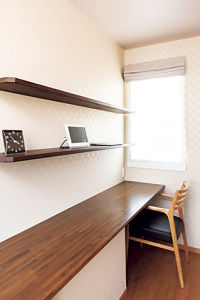 ご主人の仕事場、寝室脇の書斎スペースにも収納棚を設置。
