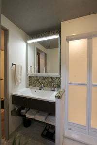 もともとはシンプルな洗面化粧台をお使いでしたが、せっかくリフォームするならと、憧れていらっしゃったタイルを使った洗面化粧台にすることに。同じ空間とは思えないほどに見違えた洗面脱衣室。ラグジュアリーな空間を引き立たせるシーラインが良く似合います。デザインだけではない、お手入れ性のよさも決め手でした。