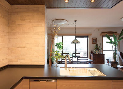 入居時からお気に召さなかったというキッチンの吊戸棚を取り払い、空間が開放的に。イタリア製の凹凸のある壁材が、やはり凹凸のある玄昌ブラックのキッチンカウンターとよくマッチし、ハイセンスなキッチンリフォームに仕上がりました。ダウンライト照明や羽目板上の間接照明がリビングの雰囲気まで一変させ、上質な大人の暮らしを演出します。