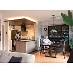入居時からお気に召さなかったというキッチンの吊戸棚を取り払い、空間が開放的に。イタリア製の凹凸のある壁材が、やはり凹凸のある玄昌ブラックのキッチンカウンターとよくマッチし、ハイセンスなキッチンリフォームに仕上がりました。ダウンライト照明や羽目板上の間接照明がリビングの雰囲気まで一変させ、上質な大人の暮らしを演出します。