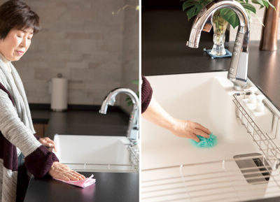 お掃除もラクになって、「いつお客様が来られてもいいように、キッチンをきれいにしておきたい」とお考えです。「Lクラス」のシンクはシンプルなつくりのため、ゴミも布巾もその場で片付ける習慣がつきました。サッとひと拭きで美しさが保てます。